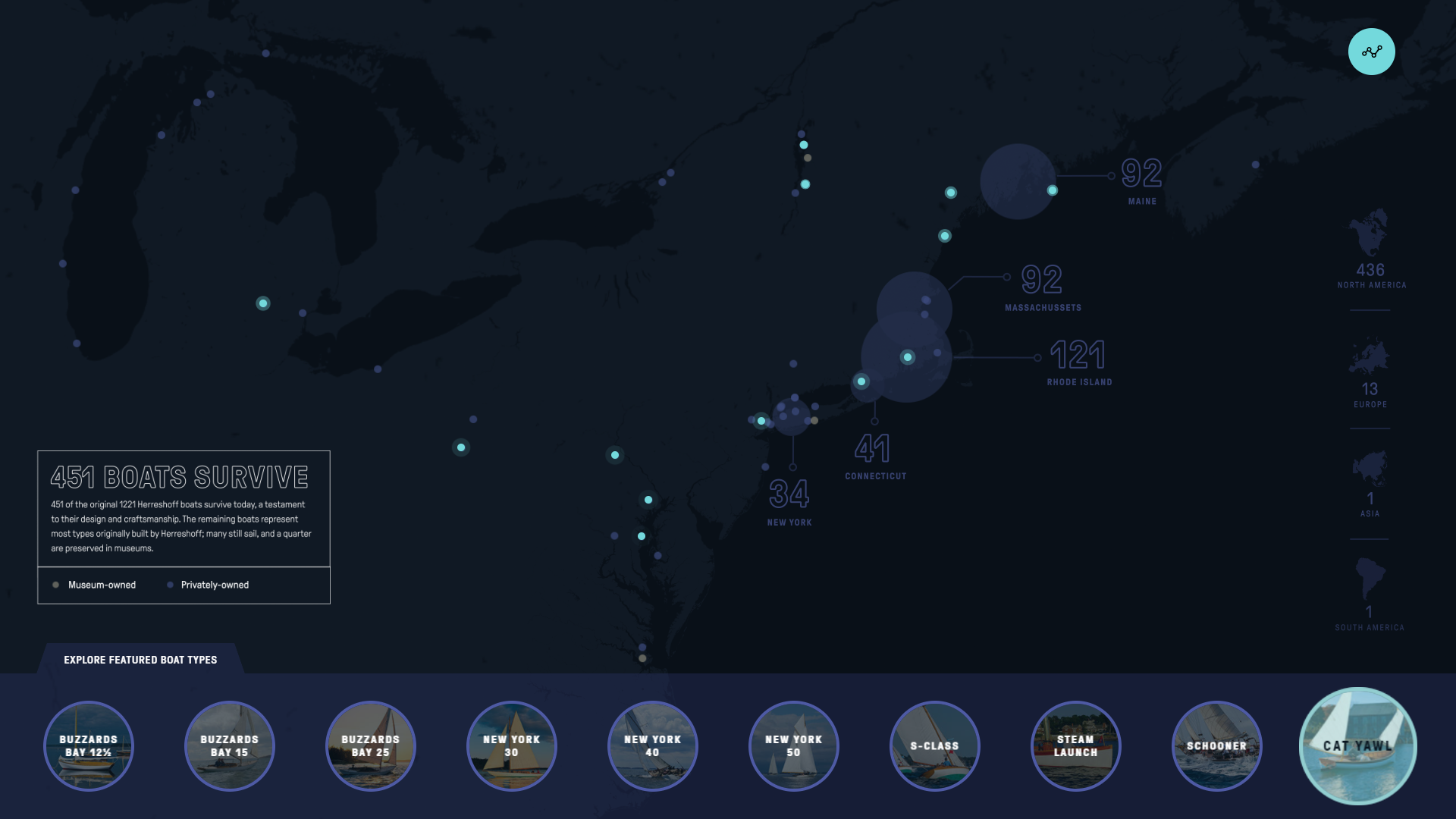An interactive map traces the surviving Herreshoff boats across the globe, revealing their exceptional survival rate and underscoring the timeless artistry and craftsmanship that define their legacy.